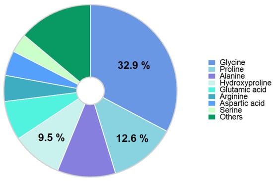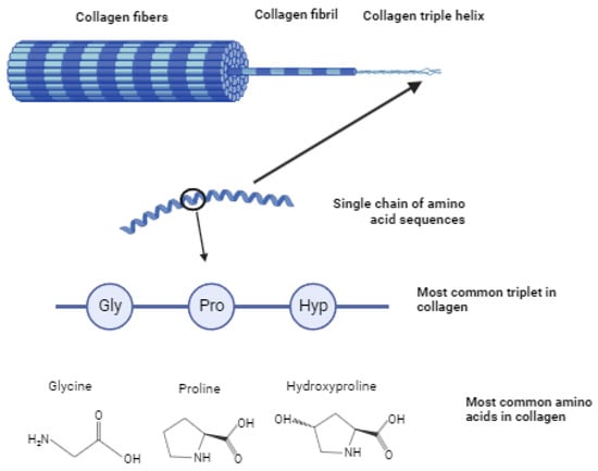 Collagen is the most important extracellular matrix protein synthesized in the human body, the primary structure of which is formed as an α-chain. The main amino acids in the chain are glycine (~33%) and proline and hydroxyproline (~22%) (Figure 2). Each α-chain consists of approximately 1014 amino acids with a molecular weight of approximately 100 kDa.