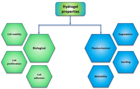 New tissue growth requires appropriate hydrogel design parameters. Hydrogels must be biocompatible to function properly in vivo, to avoid cell damage and immune system reactions, and biodegradable to replace new tissue. Like the natural extracellular matrix, hydrogels should facilitate cell migration, proliferation, and adhesion. Mechanical properties will depend on the swelling degree, degradation rate, and cross-linking degree of the hydrogel. All hydrogel properties can be roughly divided into biological and physicochemical properties (Figure 4).
