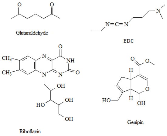 One of the collagen disadvantages is its biodegradability under the influence of proteolytic enzymes—collagenases. To slow down the biodegradation of collagen-based scaffolds, as well as to give them mechanical strength, cross-linking of collagen fibers with various chemical agents is used (Figure 5). Cross-linking agents interact with collagen through covalent, hydrogen or coordination bonds, and ionic interactions with functional groups of collagens, such as hydroxyl, amino, amide, and carboxyl, thereby changing the mechanical properties of collagen and also reducing the rate of thermal and enzymatic hydrolysis, which makes it possible to regulate biodegradation rate and obtain stable collagen-based biomaterials. In this way, three-dimensional cross-linked scaffolds of various architectures are obtained.