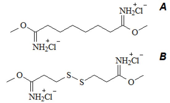 Among the most used cross-linking reagents is glutaraldehyde, which is the “gold standard” in the development of tissue engineering constructions [64,65,66]. Because the molecule has two carbonyl groups that react with primary amino groups, it can function as a bifunctional cross-linker. However, toxicity and long-term calcification are the main disadvantages of glutaraldehyde cross-linked collagen [67,68,69,70]. In the case of glutaraldehyde cross-linked collagen, RGD sequences are shielded from fibroblast integrins, leading to decreased adhesion, migration, proliferation, and new collagen synthesis. Dimethyl suberimidate (DMS) has been proposed as an alternative to glutaraldehyde (Figure 6A) [71,72]. Collagen cross-linked with DMS turned out to be less toxic than collagen cross-linked with glutaraldehyde, but the thermal stability of the hydrogel deteriorated. In the search for reagents like DMS, but which would significantly increase the thermal stability of collagen, dimethyl 3,3′-dithiobispropionimidate (DTBP) was discovered (Figure 6B) [73]. The biocompatibility of cross-linked collagen samples studied by subcutaneous implantation in rats shows that although glutaraldehyde- and DTBP-treated collagen does not degrade within 4 weeks, DTBP-cross-linked collagen has a higher level of biocompatibility than glutaraldehyde-treated matrices, as demonstrated in structural studies and histological analysis [73].