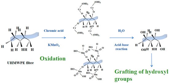 | Chromic acid treatment | Employs highly corrosive oxidants | Simple and economical, accompanied by unnecessary chemical reactions that significantly improve the interfacial properties of UHMWPE but impair the inherent strength and strain of the material | – – 63 → 49 | Tensile strength: 34% (↑) Bending strength: 23% (↑) -C-O content: 0.2% → 4.94% (↑) – | [75] [76] [79] |