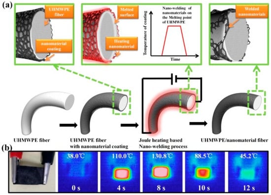 - Gao, Q.H.; Wang, M.L.; Chen, J.; Zhang, M.J.; Zhao, J.C.; Zhang, M.X.; Hu, J.T.; Wu, G.Z. Fabrication of new conductive surface-metallized UHMWPE fabric with improved thermal resistance. RSC Adv. 2020, 10, 15139–15147. [Google Scholar] [CrossRef]