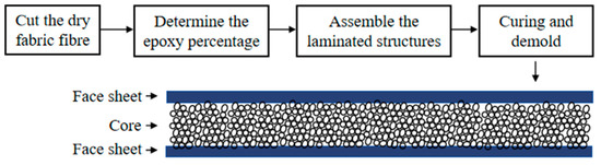 The glass fiber reinforced epoxy matrix laminates were manufactured by a wet layup process for the sandwich panels. The fiber/resin weight ratio deduced from the dry weight of the fabric and the final weight of the cured samples was approximately 60:40. The dimensions of the square plates were fixed as 150 mm × 150 mm. Six layers of plain woven glass fabric with the ply orientation [0/45/0]s were used. The two face-sheet laminates of glass fiber were bonded on each side of the core material, and the sandwich panel was co-cured at room temperature under a vacuum bag for 24 h to ensure good adhesion. The nominal thickness of the cured sandwich panels was 14 mm, with a 10 mm thick core and 2 mm thick face-sheets. This procedure is as follows: ① Cut the dry glass fiber fabric larger than the core material, in the orientation as mentioned above; ② Weigh the fiber to determine the amount of epoxy resin needed; ③ One face-sheet is laid on a bench, and the core material is placed on top of the sheet. The process is repeated for the other face-sheet; ④ The panel is then placed in the vacuum machine with a weight added on top to cure for 24 h (Figure 1).
