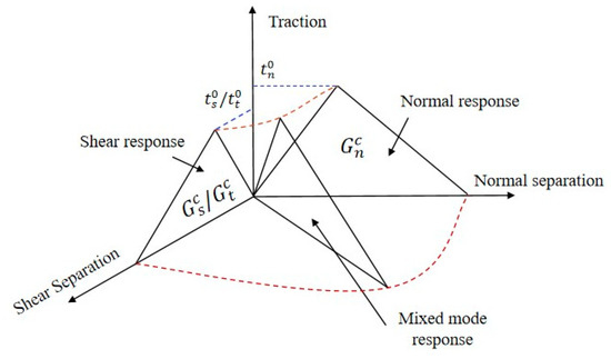 To investigate the interface damage of a composite panel, the cohesive zone model is used (Figure 3). The model provides a relationship between cracks length and fracture toughness in the normal direction and shear direction as follows: