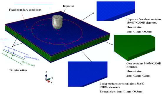 The low-velocity impact simulation is conducted by the finite element software ABAQUS. Although the experimental process is only a few milliseconds, the finite element simulation may take dozens of hours. Considering the efficiency and accuracy of numerical simulation, this paper adopts the finite element mesh model shown in Figure 5. The geometry dimension is modeled according to the specimen design in Section 2. The number and quality of meshes affect the simulation time and large cell distortion deformations. The meshes are divided using intermediate local encryption. The composite panel and cores are separately modeled with 159,607 and 34,656 solid elements C3D8R. Tie interaction is applied to model the connection between panels and core. The boundary conditions were set with constraints by prescribing a fixed displacement for nodes outside the circular area diameter, i.e., all nodes outside 135 mm in the sandwich plate to be fixed. The impactor is modeled as a rigid body with a diameter of 16 mm.