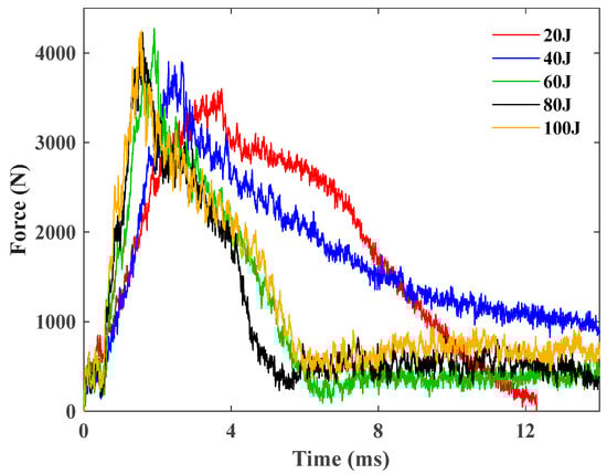 The raw data obtained from the drop hammer impact device are expressed as a time axis of the contact force, i.e., the correlation of the contact force between the impactor and the samples over time. Under the impact of a 5.5 kg impactor, the contact force histories of the GFRP sample (face-sheets) under different energies from 20 to 100 J are shown in Figure 6.