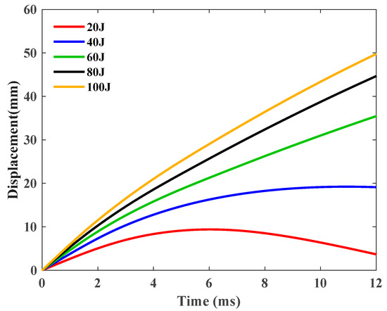 Displacement–time curves of the GFRP sample under 20 J, 40 J, 60 J, 80 J, and 100 J.