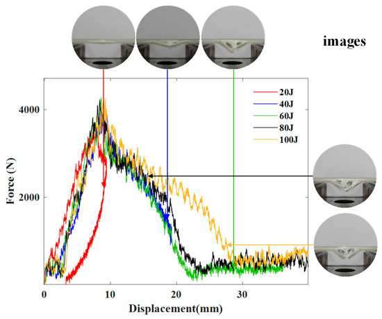 In order to investigate the change of the strength of the specimens during the impact process, we made force–displacement diagrams. The contact force–displacement curves corresponding to each energy level for all tested simple GFRP specimens are compared in Figure 8.