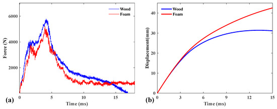 The contact force from the experimental results and numerical results are compared in Figure 14. The detailed values are listed in Table 3. For the sandwich structure with a wood core, the contact peak force from the experimental results and numerical results are 5794 N and 5329 N; the relative error is 8%. For the sandwich structure with a PS foam core, the contact peak force from the experimental results and numerical results are 5794 N and 5329 N; the relative error is 18%. The numerical model can reflect the impact mechanical response to a certain extent. The sandwich structure with cork wood core exhibited a higher contact force than that with a PS foam core.