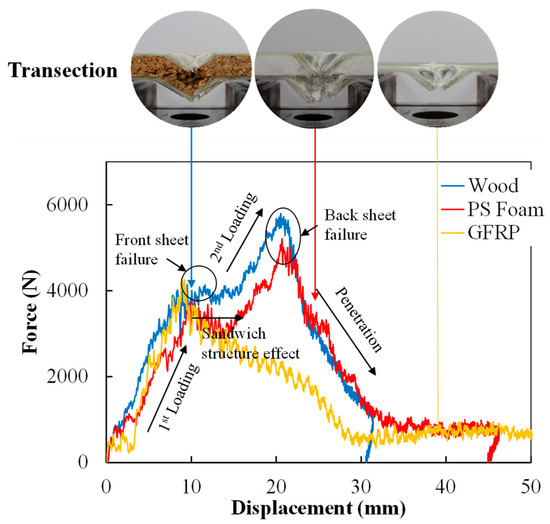 Contact force–displacement curves of the sandwich structure with different cores under 100 J and cross-sectional images after impact.