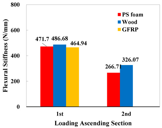 Comparison of the initial (1st) and secondary (2nd) flexural stiffness of sandwich panels via the original slope of the force–displacement curve in Figure 11.