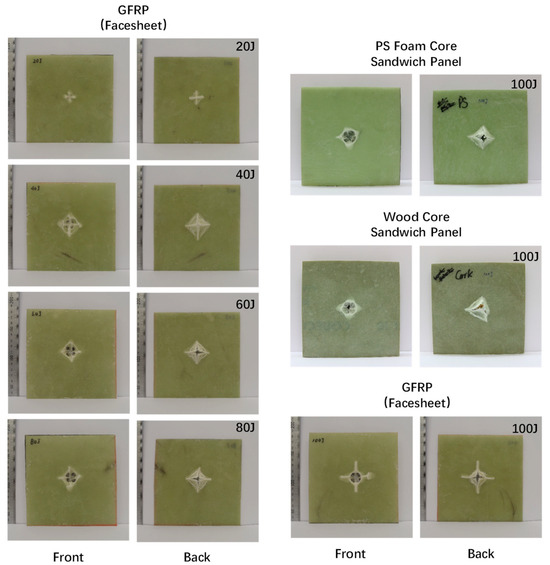 All the experiments included the single GFRP plate with 20 J, 40 J, 60 J, 80 J, and 100 J energy impact tests and sandwich structures (with PS foam and cork wood cores) with 100 J impact tests.