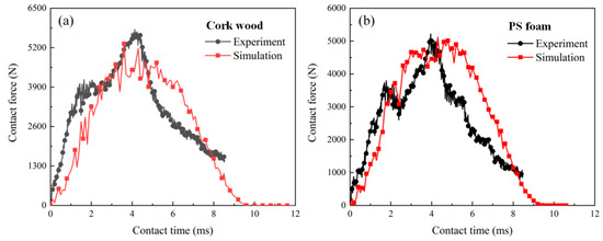 Contact force history from experiment and simulation results: (a) sandwich structure with cork wood core; (b) sandwich structure with PS foam core.