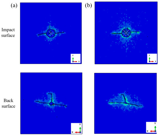 The failure patterns of sandwich structures with different cores are shown in Figure 16. For the impact surface, the impact surfaces were fragile at the impact point. The cracks through the impact point are observed on the impact surface. For the back surface, cracks in a T-shape were observed on the back surface of the sandwich structure. There were also some fragile areas at the impact point. The fragile areas at the back surface were much smaller than those on the impact surface.