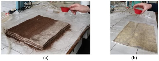 The nonwoven stacks were weighed, and 20% by weight of soda lignin (Protobind 2000) or lignosulfonate, respectively, was added. The lignin, in powder form, was sieved after each layer of nonwoven material, specifically between layers 1 and 2, 2 and 3, 3 and 4, 4 and 5, and 5 and 6 of the nonwoven stacks (Figure 1).