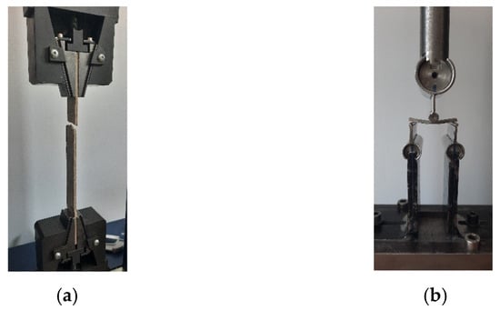 Tensile tests were conducted using LBG testing equipment (Azzano San Paolo, Italy). Type 2 samples were cut to a length of 250 mm and a width of 25 mm, as specified in the ISO 527-4 standard [80]. The tensile test conditions occurred at a 150 mm distance between the grips and a test speed of 5 mm/min, in accordance with the ISO 527-4:2023 standard [81] (Figure 2a). Because the determination of the tensile strength of wood-based boards is not standardized, the same standard used for composite materials has been applied.