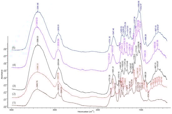 FTIR spectra of the samples: (1) Soda lignin—Protobind 2000; (2) Lignosulfonate—Domsjö Lignin DS10; (3) C-LPb2000; (4) C-LSNa; (5) C.