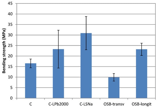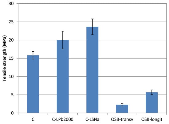The tensile strength of the obtained composites is presented in Figure 4, along with the tensile strength of oriented strand board determined in both the longitudinal (OSB-longit) and transverse directions (OSB-transv).