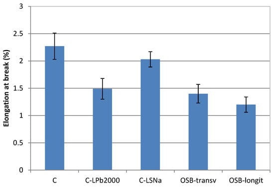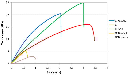 When compared to the reference composite material (C), the addition of lignin resulted in an increase in the tensile strength of lignin-based composites (a 26.5% increase in the case of C-Pb2000 composite and a 49.4% increase in the case of C-LSNa composite). Lignin can act as a compatibilizer, reducing the interfacial tension between the hydrophilic natural fibers and the hydrophobic polypropylene matrix. This improved compatibility can lead to improved adhesion, more efficient stress transfer, and better mechanical properties [87]. The lignosulfonate-based composite showed a higher tensile strength than the soda lignin-based composite due to the higher molecular weight of the lignin compound, which can be attributed to both its origin (wood lignin typically has a higher molecular weight than lignin from annual plants) and the less destructive separation process. The tensile strength of all composite materials was much higher than the tensile strength of oriented strand board in both directions.