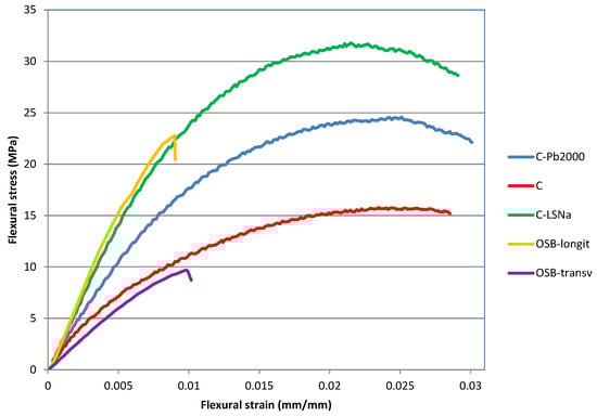 Figure 8 presents the flexural stress–strain curves of the analyzed materials. Both lignin-based composites exhibit steeper curves compared to the C composite and OSB-transv, indicating higher stiffness and greater resistance to bending under applied loads. However, the curve of the OSB-longit sample exhibited the steepest slope, indicating the highest flexural stiffness.