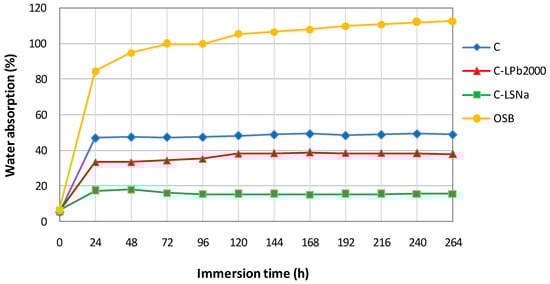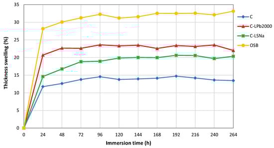 As can be seen in Figure 10, all composite materials showed better dimensional stability compared to oriented strand board. The maximum thickness swelling of the composites ranged between 14.7% (C) and 23.6% (C-LPb2000), while the OSB showed a maximum thickness swelling of 32.6%.