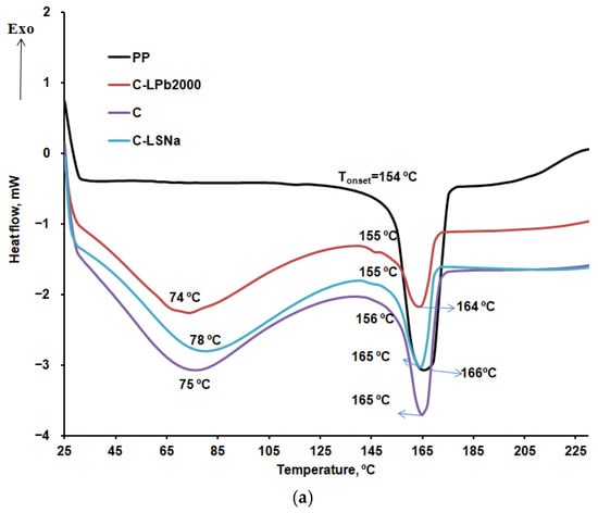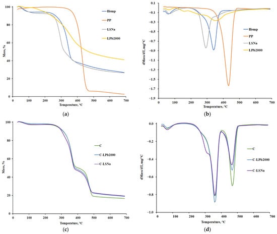 Unfortunately, regarding the composites based on hemp and polypropylene with or without lignin additives, the FTIR spectra are not very specific since the hemp fibers themselves contain lignin in the cell wall, which prevents an individualization of the spectra through specific absorptions of the functional groups of the lignin-based additives (Pb2000, LSNa).