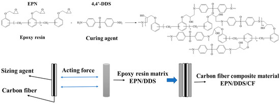 Here, T400 carbon fiber tow was sized using three different sizing agents: S2, obtained from the Toray Co., Japan, and S1 and S3, supplied by the Jilin Qianren Innovative Materials Co. Ltd. (Jilin, China), with their compositions remaining proprietary. E-1NT, with a molecular weight of 370 and an epoxy equivalent of 185, was also provided by the Jilin Qianren Innovative Materials Co. Ltd. AG-80, a 4,4’-diaminodiphenylmethane epoxy resin with an epoxy equivalent of 114, and the curing agent DDS (4,4’-diaminodiphenyl sulfone) were supplied by the Tiantai High-tech Co. Ltd. (Guangzhou, China). Additionally, EPN, with an epoxy equivalent of 174.6, was sourced from the Nanya Electronic Materials (Kunshan) Co. Ltd. (Jiangsu, China).