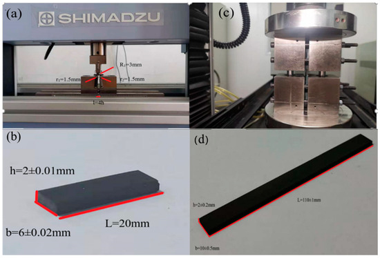 The instrument (a) and specimen size (b) in testing ILSS; the instrument (c) and specimen size (d) in testing compressive strength.