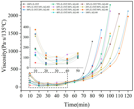 Briefly, 100 g of AG-80, E-1NT, or a mixture of AG-80 and E-1NT with 40 g of DDS was prepared in a beaker and pretreated at 135 °C. The formulation ratio of AG-80 to E-1NT was varied from 0% to 100%. The viscosity was measured and recorded every 10 min using a Brookfield dial viscometer (LVT230), and the test was halted when the viscosity approached 2000 cP.