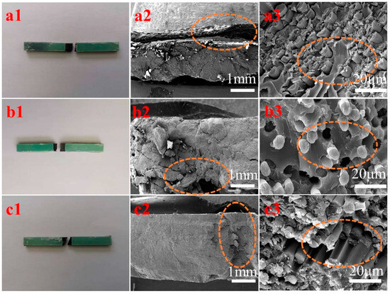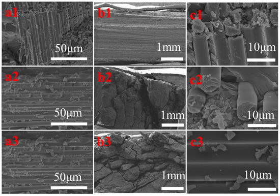 Different types of sizing agents affect the ILSS of carbon fiber composites. Figure 9a shows that the sizing agents S1, S2, and S3 had an effect on the ILSS of the CF composite, but for different resin matrixes and formulated resin matrixes, the effect trend was the same. The cationic sizing agent S1 had a tertiary amino group and could form positive and negative charges with the CF, in turn increasing the interfacial adhesion between the carbon fiber and sizing agents. Therefore, the cationic sizing agent S1 exhibited the highest ILSS, the non-ionic sizing agent S2 showed the next best strength ILSS, and the anionic sizing agent S3 showed the weakest ILSS. Figure 10(a1–a3) are SEM fracture images of composites after their ILSS testing. It can be seen from Figure 10(a1) that there are a large number of resin fragments between fibers, while Figure 10(a2,a3) have fewer resin fragments exposed on the surface of the fiber bundle compared to Figure 10(a1), consistent with their ILSS.