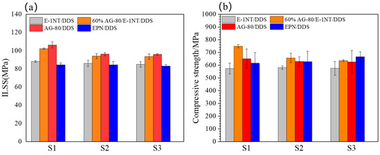 (a) ILSS with four types of resin matrix/sizing agents S1, S2, and S3/CF. (b) Compressive strength with four types of resin matrix/sizing agents S1, S2, and S3/CF.