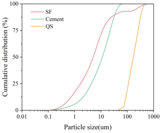 Particle size distributions of cement, silica fume (SF), and quartz sand (QS).