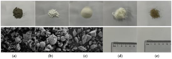 Images of materials used: (a) cement (scale bar is 5 μm), (b) silica fume (scale bar is 500 nm), (c) quartz sand (scale bar is 50 μm), (d) PVA fibers, and (e) steel fibers.