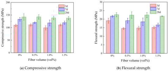 The 6 mm Type I PVA fibers were added to the specimens at 0.5%, 1.0%, and 1.5%. Figure 3 shows the compressive strength and flexural strengths at 3 d, 7 d, and 28 d. The results showed that at an early age (3 d and 7 d), the mechanical strength was adversely affected by the addition of fibers, which was likely due to hydration retardation caused by increased superplasticizer dosage to disperse the fibers. However, the compressive and flexural strength at 28 d were recovered to similar values of the control mixture (0% fiber dosage). In addition, Figure 3 shows that fiber dosages of more than 0.5% could cause a slight decrease in both compressive strength and flexural strength.