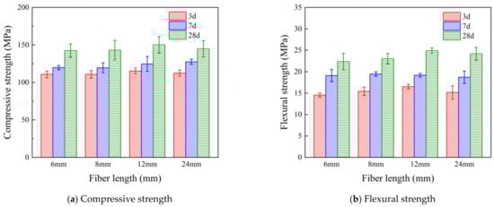 Type I fibers of a 0.5% dosage with different lengths of 6 mm, 8 mm, 12 mm, and 24 mm were added to UHPC specimens. The compressive strength and flexural strength at the corresponding ages are shown in Figure 4. Compared to Figure 3, it can be seen that at a 0.5% fiber dosage, all four different lengths of fibers enhanced the compressive strength and the flexural strength. In addition, a 12 mm fiber length demonstrates the highest increase of 5.7% and 10.6% in compressive strength and flexural strength, respectively. Therefore, 12 mm was determined to be the optimal length of fibers in this study.