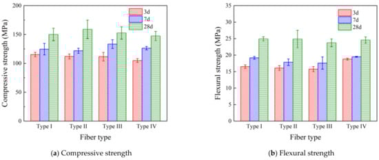 Effective surface treatment of PVA fibers can improve the interfacial bonding between fibers and the UHPC matrix, which will assist stress transfer and distribution. Insufficient interfacial bonding could cause the fiber to be pulled out prematurely under stress, limiting the crack-bridging effect and energy absorption. The results shown in Figure 5 demonstrate the effect of different fiber treatments. It can be seen that the addition of four types of fibers increased the mechanical strength of UHPC at a length of 12 mm with a fixed 0.5% fiber dosage. Compared with the specimens with unmodified fiber (Type I), the mechanical strength was further improved by Type II fibers. The flexural strength was almost the same as that of Type II fibers, and the compressive strength was increased by 5.9%. The compressive strength of Type III fibers was slightly increased by 1.8%, and the flexural strength was decreased by 4.9%. The compressive and flexural strengths of the specimens with Type IV fibers were both decreased. It was then determined that the 12 mm Type II fiber at a 0.5% dosage achieved optimum performance among all mixtures, with 158.97 MPa in compressive strength and 24.86 MPa in flexural strength at 28 d, which were 12.0% and 10.0% higher than the control UHPC without fiber. The optimum enhancement is likely due to the higher density of the hydroxyl group in Type II fiber because of the surface treatment. This result is consistent with Yao et al. [27], in which an optimum compressive strength enhancement was from a mixture with 0.5% PVA fibers of 12 mm in length. The enhancement was attributed to the high bonding strength between PVA fibers and the cementitious matrix.