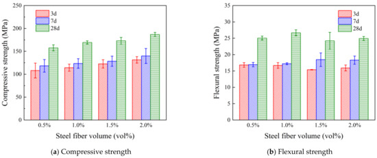 Steel fibers were added at 0.5%, 1.0%, 1.5%, and 2.0%, and the mechanical strengths are shown in Figure 6. Compared to the control UHPC, the addition of steel fibers can significantly improve the compressive strength. The compressive strength of steel fiber at a 2.0% dosage reached 186.83 MPa with a 17.5% increase. However, it should be noted that at a 0.5% dosage, PVA fiber (12 mm Type II) demonstrated similar performance to steel fiber. This indicates that at lower dosages, steel fiber does not have a significant advantage over modified PVA fiber.