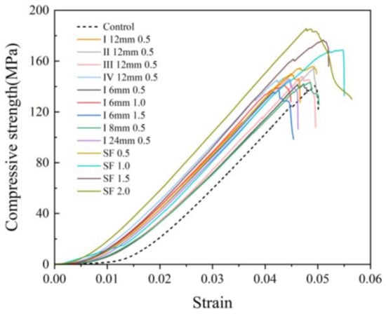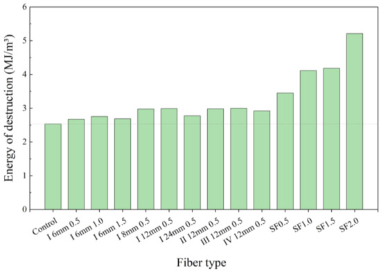 Based on the force and displacement data collected during the compressive test, the stress–strain curves of all ratios were calculated, and the energy of destruction by the specimen in reaching the peak load was obtained by integrating the area underneath the stress–strain curves (Figure 8). Then, the toughness of the concrete can be quantitatively compared to the energy of destruction [31]. In Figure 8, it can be seen that the stresses in all fiber-reinforced concretes are greater compared to the control group at the same strain, which indicates that the addition of fibers improves the load-bearing capacity of the concrete. Meanwhile, it can be seen in Figure 9 that the energy absorption capacity of fiber-reinforced concrete is also improved, and the energy absorption capacity of steel fibers for concrete is much higher than that of PVA fibers. In the PVA fiber-reinforced concrete (0.5%, I 8 mm, I 12 mm, II 12 mm, and III 12 mm), the energy of destruction has been effectively improved compared with the control by 17.4%, 18.2%, 17.8%, and 18.6%, respectively. The energy of destruction of the steel fiber-reinforced concrete (0.5%, 1.0%, 1.5%, and 2.0%) was increased by 36.4%, 62.8%, 65.2%, and 105.9%, respectively. Overall, steel fibers improve the toughness of the concrete much more effectively than PVA fibers, which is due to the high strength of steel fibers that can make the concrete withstand greater deformation and load before failure. Nevertheless, the difference between the PVA fiber and steel fiber is narrowed down at a lower dosage.