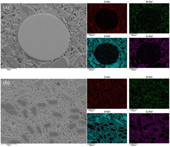 Two groups of II 12 mm 0.5 and SF 2.0 specimen sections were selected, and the BSE-SEM images and EDS mapping of the specimens are shown in Figure 10.