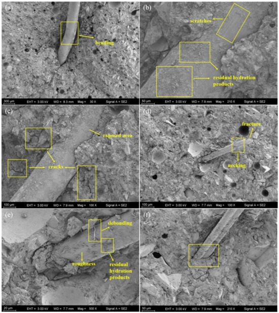 SE-SEM images of the post-fracture (flexural test) surface of the specimen are shown in Figure 11. In Figure 11a, it can be found that the steel fibers were bent after the test, indicating a strong bond between the steel fibers and the cement mortar, as well as a higher energy absorption at failure. Parallel scratches shown in Figure 11b on the surface of the steel fiber, which were caused likely due to fiber pull out, are another evidence of a strong bond. In addition, the residual hydration products on the fiber also indicate a strong adhesion between the steel fibers and the cement mortar. All steel fibers observed in the SEM images remained intact without obvious fracture, indicating the energy absorption is mainly due to the plastic deformation of the steel fiber and the friction during fiber pull out. In Figure 11c, cracks in the mortar around the steel fiber indicate anchorage failures during fiber pull out, which is also proof that the presence of the still fiber inhibited the cracks through the bridging effect [32]. This finding is consistent with the conclusion of the BSE-SEM image of the existence of a weak region around the steel fiber due to quartz sand agglomeration.