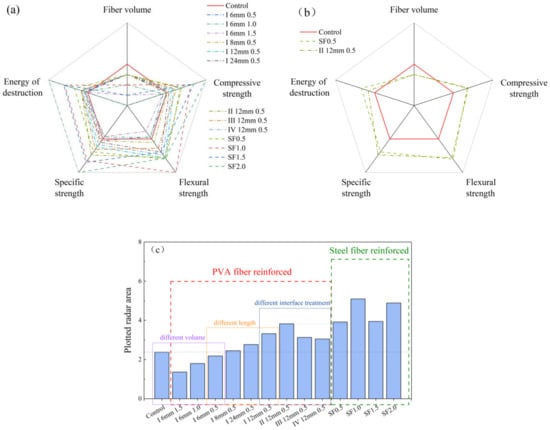 The radar charts and radar area diagrams of all UHPCs are shown in Figure 12. The performance is evaluated in five criteria: compressive strength, flexural strength, absorbed energy, specific strength, and fiber dosage. By calculating the area of the constituent pentagons, the performance of all UHPCs can be quantitively evaluated. Among them, fiber dosage was included as one criterion in order to make lower dosage more favorable. As shown in Figure 12c, most of the PVA fiber-reinforced concretes obtained improved performance, with only a decrease in performance when a 6 mm length was selected. The performance of steel fiber-reinforced concrete is much higher, indicating that in most cases, the performance improvement of the concrete resulting from the selection of steel fibers is superior to that of PVA fibers. However, it is worth noting that the performance enhancement of concrete with steel fibers and Type II 12 mm PVA fibers at 0.5% is very close to each other. Further observation in the radargram in Figure 12b reveals that SF 0.5 is only slightly better than Type II 12 mm 0.5 in terms of absorbed energy and flexural strength but lower in compressive and specific strengths, which shows that PVA fiber has the potential to replace steel fiber at a lower dosage.