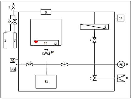 Scheme of the device for measuring gas permeance of composite membranes. Legend: 1,2,2′,5,7,9,12,14—shut-off valves; 3—pressure regulator; 4—membrane cell; 6—pressure sensor; 8—vacuum pump; 10—three-way valve; 11—buffer volume tank; 13—pulse counter combined with the pressure regulator. A1—power supply to the unit; A2—switching of the vacuum pump; A3—switch for setting the overpressure value.