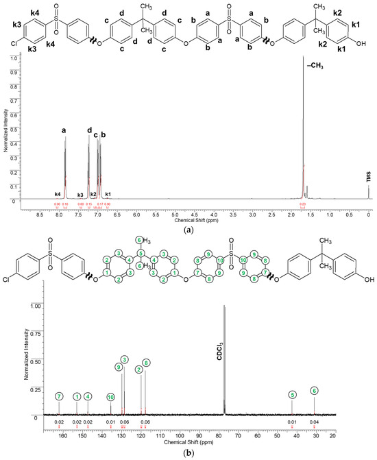 Figure 3a illustrates the 1H NMR spectrum of the PSF-1 sample as an example. The doublet peaks of chemical shifts δ = {7.84 and 7.86 ppm} H-a (4H, d), δ = {6.92 and 6.94 ppm} H-b (4H, d), δ = {6.99 and 7.01 ppm} H-c (4H, d), and δ = {7.23 and 7.25 ppm} H-d (4H, d) correspond to the protons located in the aromatic rings of the main polymer chain. The singlet signal δ = 1.69 ppm (6H, s) was attributed to the protons of the methyl groups of the main chain. The doublet peaks δ = {6.74 and 6.76 ppm} (2H, d) and δ = {7.07 and 7.09 ppm} (2H, d) correspond to the protons of the terminal aromatic rings bound to the terminal hydroxyl groups. The doublet signals δ = {7.44 and 7.47 ppm} (2H, d) and δ = {8.03 and 8.06 ppm} (2H, d) are assigned to the protons of the aromatic rings bound to the terminal chlorine groups.