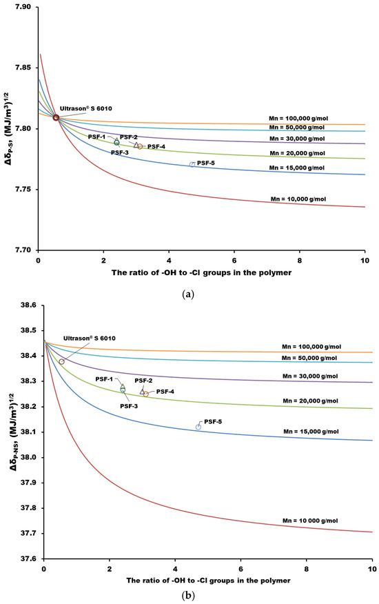 The solubility parameters of the synthesized and commercial PSFs were calculated using the Hoftyzer–van Krevelin group contribution method [54]. Equations (1)–(3) were used to calculate δd, δp, and δh parameters characterizing the dispersion and polar interactions and the interactions due to formation of hydrogen bonds, respectively: