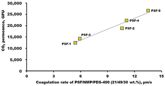 The NIPS method allows one to obtain supports in a wide range of pore sizes and porosity. Chemical modifications [29,30,31], the incorporation of various fillers into the membrane matrix [32,33,34,35], or the introduction of various additives in coagulation baths [36] are generally used to improve the performance of PSF membranes. For example, in the case of hollow fiber membranes, varying the spinning process parameters makes it possible to control the transport properties of the resulting membranes [37,38]. A new concept for spinning porous PSF fiber supports with an inert bore liquid was suggested in [39]. The new technique made it possible to obtain supports with gas permeance, which was an order of magnitude higher than that of supports reported in the literature.