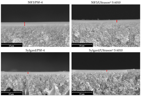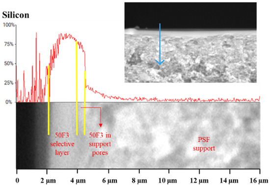 To estimate the depth of penetration of the selective layer polymers into the pores of the support, EDX analysis of cross-sections of the composite membranes was performed. Silicon (Si), which is present in 50F3 and Sylgard 184 and absent in PSF, was chosen as the main chemical element for analyzing the distribution profiles. As an example, Figure 10 shows the EDX profile of a 50F3/Ultrason® S 6010 composite membrane. It can be seen that the selective layer on the support surface consists of a silicon-containing material. Its thickness is approximately 2 μm, which is consistent with the SEM results (Table 7). The depth of penetration of the selective layer polymer into the porous support was evaluated according to a reported method [66]. EDX analysis showed that 50F3 penetrates into the support of commercial Ultrason® S 6010 PSF to a depth of 0.5 μm. In the case of 50F3/PSF-2 and 50F3/PSF-4 composite membranes, the penetration depths are 0.8 and 0.6 μm, respectively. The depths of Sylgard 184 penetration into the pores of PSF-4 and commercial Ultrason® S 6010 PSF supports were also estimated by the EDX profiles (Table 7) and amounted to 0.5 and 0.3 μm, respectively.