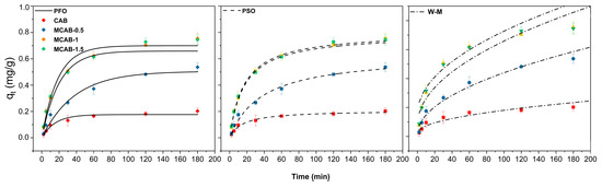 The experimental data fitting with two kinetic models is shown in Figure 6. The relevant parameters were calculated (shown in Table 2) using Equations (5)–(7). The correlation coefficients (r2) indicate that in addition to the W-M model, both the first-order and second-order kinetic models are well fitted to the experimental data. The results suggest that the controlling step of the adsorption process is not intraparticle diffusion but rather surface reactions or intermolecular interactions. This implies that the adsorption process is likely governed by surface chemical processes, the number of available adsorption sites on the adsorbent, and the interactions between the adsorbate and adsorbent, with diffusion playing a less significant role in limiting the overall rate. Nonetheless, compared with the pseudo-second-order model (R2 = 0.994 ± 0.002, 0.991 ± 0.004, 0.993 ± 0.001, and 0.998 ± 0.006), the pseudo-first-order model (R2 = 0.994 ± 0.002, 0.991 ± 0.004, 0.993 ± 0.001, and 0.998 ± 0.006 for CAB, MCAB-0.5, MCAB-1, and MCAB-1.5, respectively) slightly underestimates the metal uptake of Hg(II) by both adsorbents and is inaccurate in characterizing the kinetic mechanism. Furtherly, the equilibrium capacity is 0.18 ± 0.01, 0.57 ± 0.01, 0.79 ± 0.01, and 0.78 ± 0.02 for CAB, MCAB-0.5, MCAB-1, and MCAB-1.5, respectively, calculated by the pseudo-second-order fitting model. This indicates that the intrinsic adsorption capacity was improved notably by self-assembly mineralization based on the comparison of adsorption rate constants of the pseudo-second-order model, i.e., k2 (MCAB-0.5) < k2 (MCAB-1.5) ~ k2 (MCAB-1) << k2 (CAB), implying that the adsorption rate was significantly improved by modification. As for the relatively higher k2 of MCAB-0.5 compared to the other two modified samples, this is probably due to the lower adsorption capacity requiring a shorter time to reach equilibrium.