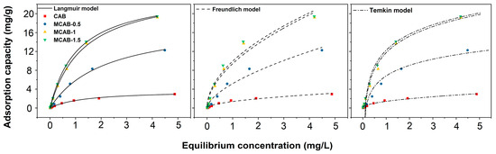 The surface properties and affinities of the adsorbent can be expressed by certain constants that characterize the adsorption isotherms, presented in Figure 7. The adsorption isotherm constants are presented in Table 3. Compared to the Langmuir and Freundlich isotherm models, the Temkin model generally exhibits lower fitting accuracy, primarily due to its overly simplified assumptions. Specifically, the Temkin model assumes that the adsorption heat decreases linearly with increasing adsorption, which may not accurately reflect the actual variation in adsorption heat, especially in cases where the energy distribution of adsorption sites is heterogeneous. Additionally, the Temkin model assumes that the adsorption sites on the adsorbent surface have similar energy levels, failing to fully account for surface heterogeneity, which limits its applicability to systems with significantly heterogeneous surfaces. In contrast, the Langmuir model assumes uniform adsorption sites and is suitable for describing monolayer adsorption, while the Freundlich model introduces a logarithmic function to better accommodate heterogeneous surfaces, leading to more accurate fits in many adsorption processes. Therefore, the Temkin model may not capture the non-ideal behavior of the adsorption process in complex systems, resulting in lower fitting accuracy. The maximum capacity qm determined from the Langmuir isotherm indicates the limiting capacity of the absorbent for Hg(II) ions. It was found that the maximum capacity qm for the MCAB-1 sample of 48 ± 1 mg/g was much higher than that for CAB of 18 ± 1 mg/g. The correlation coefficients (R2) for MCABs and CABs show that the Langmuir isotherm model is properly used to describe both adsorbents, which indicates that monolayer adsorption of heavy metal ions is formed on the outer surface of adsorbents [52]. The Freundlich model is used to characterize the adsorption on a heterogeneous surface and is not limited to mono-shell formation. However, the values of the correlation coefficients (R2) calculated by the Freundlich isotherm model (0.970 ± 0.006, 0.968 ± 0.003, 0.965 ± 0.003, and 0.960 ± 0.009) are lower than those from Langmuir model (0.996 ± 0.002, 0.995 ± 0.004, 0.998 ± 0.003, and 0.999 ± 0.006 for CAB, MCAB-0.5, MCAB-1, and MCAB-1.5, respectively), which indicates that the Freundlich model is unacceptable for describing the adsorption process.