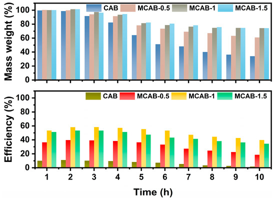 Long-duration (10 h) adsorption was conducted to investigate the effect of mineralization on the stability of the adsorption efficiency and retardation of material wear. Figure 8 shows the changes in mass weight and adsorption efficiency during long-duration adsorption at pH = 3. Both indices of all samples decreased as the adsorption progressed. Specifically, after 10 h of adsorption, the mass weights of CAB, MCAB-0.5, MCAB-1, and MCAB-1.5 were 38.6%, 61.2%, 74.3%, and 74.3% of each initial mass, respectively. Meanwhile, the efficiency of these four samples decreased from 10.1%, 38.2%, 57.4%, and 56.4% to 2.7%, 21.4%, 43.2%, and 39.7%, respectively. In addition, the dynamic changes in quality and efficiency indicate that there is a positive correlation between them. This improvement indicated that mineralization not only improved the adsorption efficiency but also enhanced the stability of adsorbent performance.