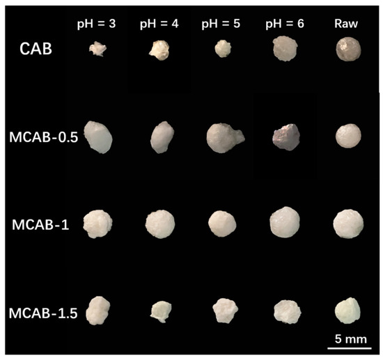 Macroscopic morphological changes during long-duration (10 h) adsorption for CAB and MCABs are represented in Figure 10. For CAB, the raw bead is a ball with good sphericity. After 10 h of adsorption, different degrees of disintegration are observed in various pH conditions. At a pH = 3, the bead is totally collapsed, which is in accordance with the weight ratio tests. After mineralization, the surfaces of raw modified beads, MCAB-0.5, MCAB-1, and MCAB-1.5, are whiter and more substantial compared with CAB. Additionally, the completeness of the materials is much better than that of CAB. The concentration of NH4HCO3 shows a dominant effect on the morphological changes. This is mainly because different carbonate concentrations lead to different calcium carbonate crystallization rates in the growth process of microcrystals, so the microcrystalline structure bears different degrees of local stress in the confined crystallization process. As the mineralization unit grows, the stress changes the local structure more obviously and finally leads to different macroscopic mineralization layers [59].